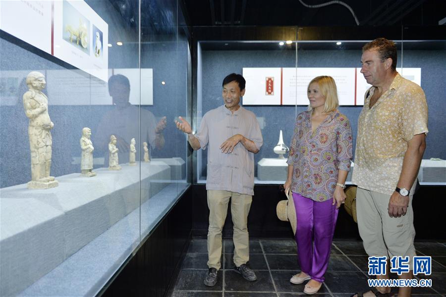 8月21日,在河北省临城县邢窑文化博览园,张志忠(左)为来自莫斯科的谢尔盖(右)及夫人讲解唐代陶瓷知识。新华社发(陈雷 摄)