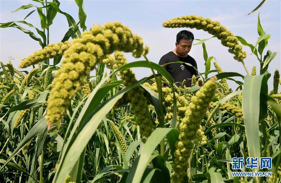 8月21日,河南省汤阴县宜沟镇尚家庵村一家农业生态园中,工作人员在查看谷子的长势。