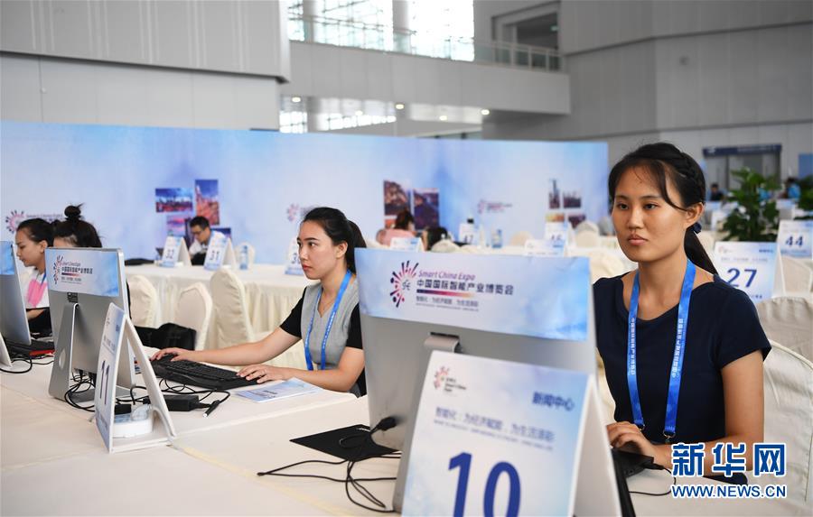 8月22日,媒体记者在2018中国国际智能产业博览会新闻中心工作。 新华社记者 王全超 摄