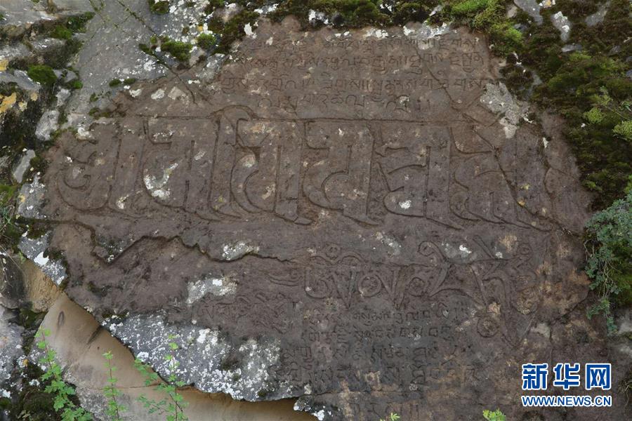 这是在青海省门源县东川镇麻当村附近岩壁上发现的摩崖石刻藏经(8月18日摄)。 新华社发(董连生 摄)