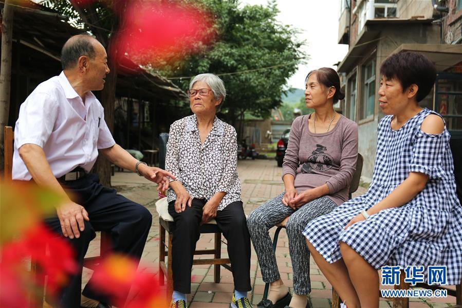 8月22日,娄树存(左一)为几名居民调解因电动车骑行造成老人跌倒引发的纠纷。 新华社发(刘环宇 摄)