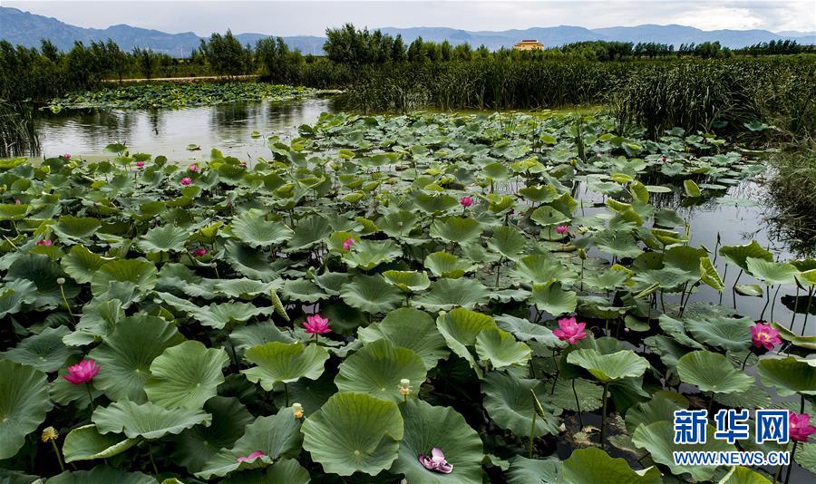 8月22日无人机拍摄的广灵县壶流河湿地盛开的荷花。