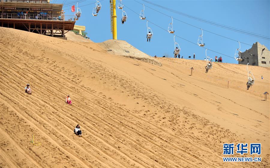 8月22日,游客在中卫市沙坡头旅游景区游玩。沙坡头旅游景区因地制宜发展沙漠旅游,旺季日接待游客量达两万人次。 新华社记者 刘军喜 摄