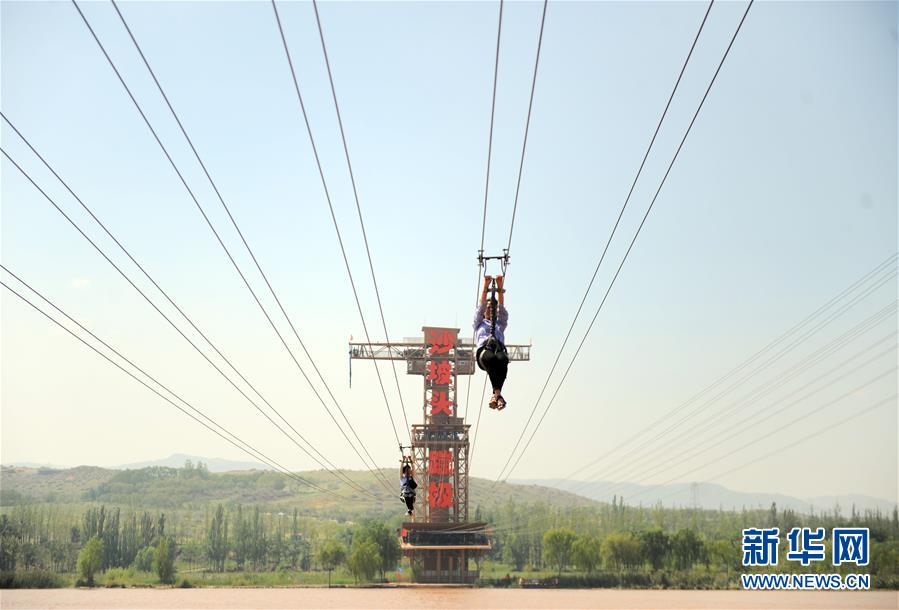 8月22日,游客在中卫市沙坡头旅游景区体验溜索。沙坡头旅游景区因地制宜发展沙漠旅游,旺季日接待游客量达两万人次。新华社记者 任鹏飞 摄