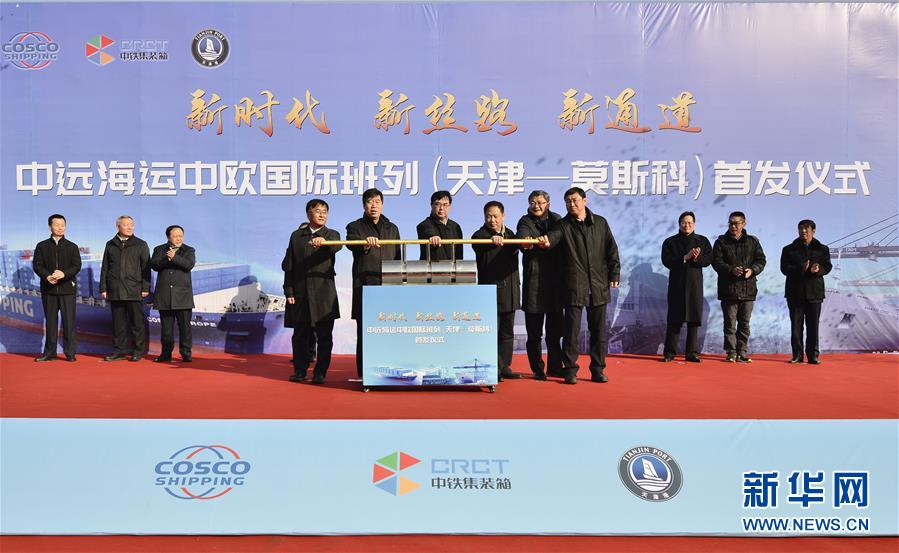 这是中远海运中欧国际班列(天津—莫斯科)首发仪式现场(1月5日摄)。 烈日当头,一辆辆集装箱卡车穿梭在码头与堆场之间,好不热闹。这种景象,得益于天津港把眼光对准发展中的堵点和痛点,主动降低费用,“真金白银”给企业让利。港口在市场中扮演的角色,正在从“收费员”向“服务员”转变。 新华社记者 毛振华 摄