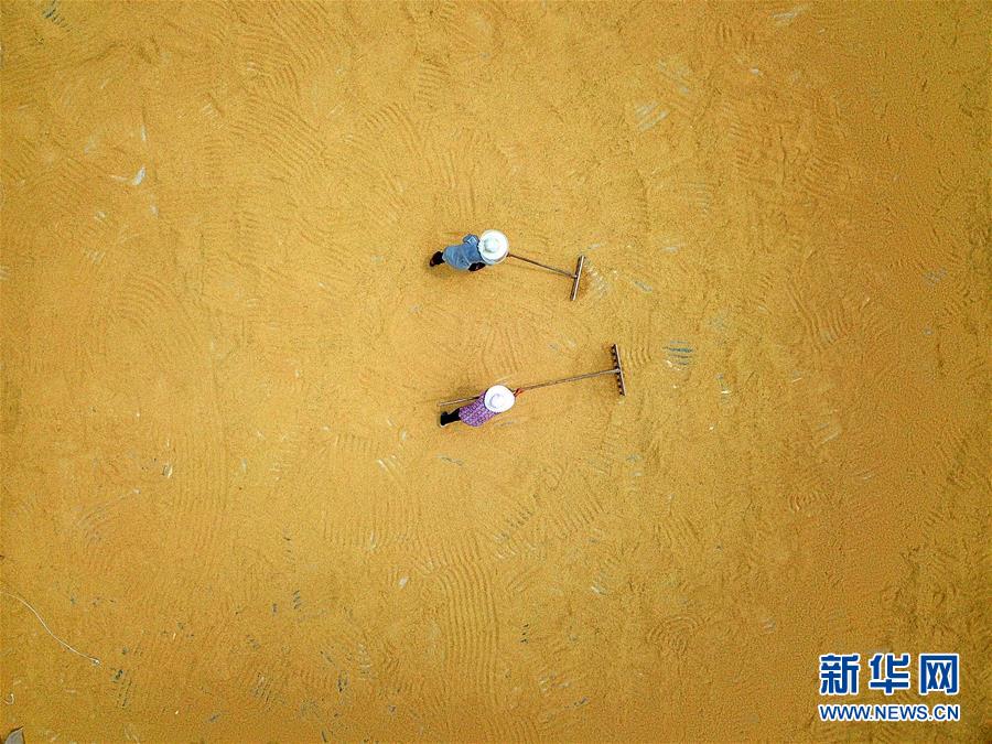 8月22日,在贵州省余庆县大乌江镇凉风村石印村民组有机水稻基地,村民在晾晒稻谷(无人机拍摄)。 新华社发(贺春雨 摄)