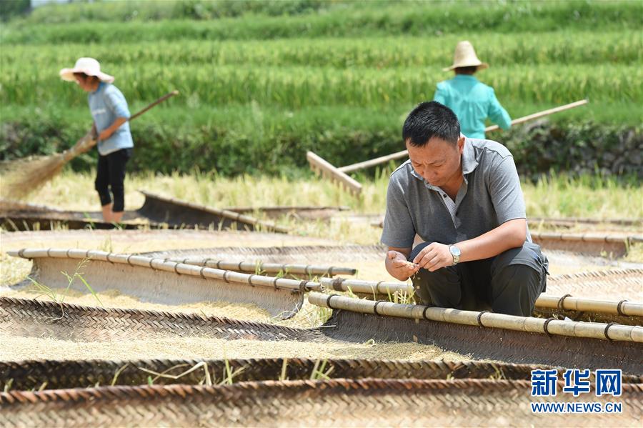 8月22日,贵州省余庆县大乌江镇凉风村石印村民组村民陈刚在查看稻谷晾晒情况。 新华社发(贺春雨 摄)