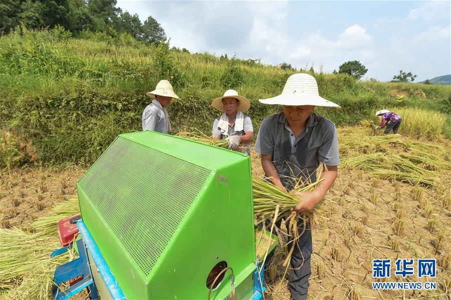 8月22日,贵州省余庆县大乌江镇凉风村石印村民组村民陈刚在为水稻脱谷。 新华社发(贺春雨 摄)