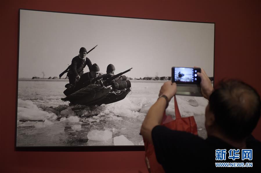 8月23日,观众在中国美术馆参观拍摄展出作品《冰上“土坦克”军事训练》。 新华社记者 鲁鹏 摄