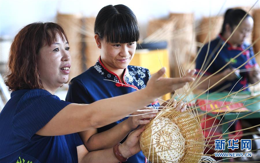 8月23日,广灵县巧娘宫手工编织专业合作社创办人刘金萍(左)为新上岗的员工传授编织技术。该合作社在全县9个乡镇免费培训近千人,为农村妇女提供就业平台,基本实现“家门口办厂、培训一人就业一人”的目标,直接带动了645名贫困妇女脱贫增收。新华社记者 陶明 摄