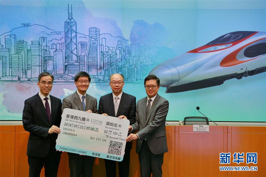 8月23日,香港特区政府运输及房屋局局长陈帆(右二)等出席新闻发布会。 香港特区政府运输及房屋局局长陈帆23日宣布,广深港高铁香港段将于9月23日正式通车。 新华社发(刘永东 摄)