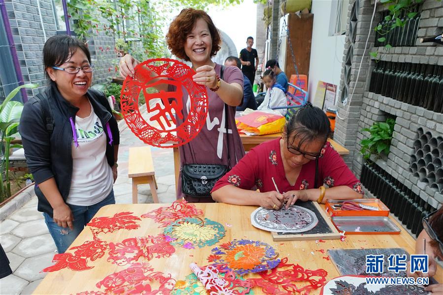 8月23日,游客在河北省滦县教场村一民宿内选购剪纸作品。 近年来,河北省滦县古城街道教场村依托临近滦州古城景区的优势,引导村民发展民宿旅游,目前已有近百户村民建成特色民宿及农家乐,拓宽了增收致富渠道。 新华社记者 牟宇 摄