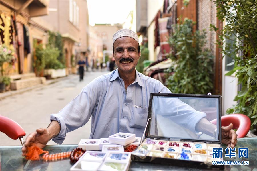 在喀什老城,来自巴基斯坦的商人在展示自己的各种珠宝(7月10日摄)。 新华社记者赵戈摄