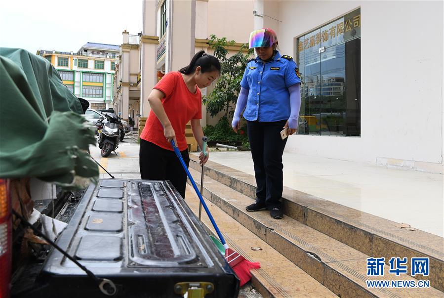 在琼中县营根镇王翠监管的路段上,王翠劝导店铺负责人清理店铺门前的垃圾(8月23日摄)。 新华社记者杨冠宇摄