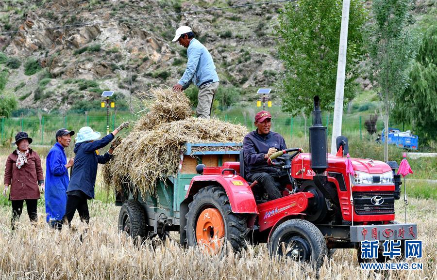 8月22日,乃东区门中岗社区种植农业合作社的村民在用小型拖拉机装运青稞秸秆。 新华社记者张汝锋摄