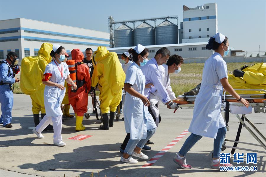 8月24日,医疗人员在应急演练中转移“伤员”。 新华社记者 邹予 摄