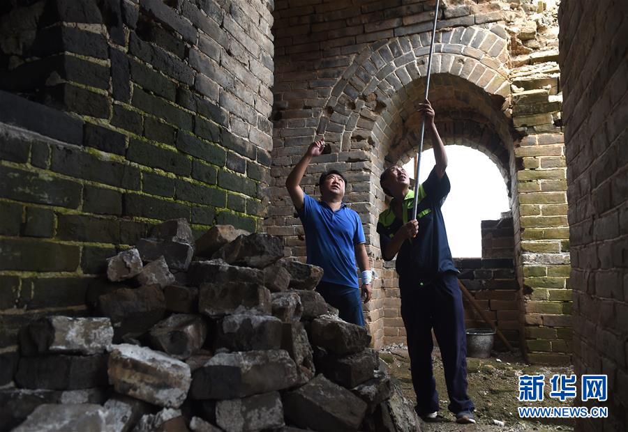 北京密云区文物管理所所长郑宝永(左)和北京市文物古建工程公司工作人员夏春友在对坍塌比较严重的敌台进行测量(8月22日摄)。 新华社记者罗晓光摄