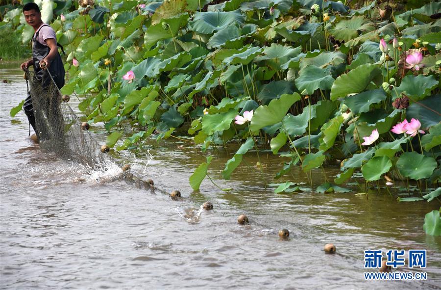 8月24日,浙江江山市凤林镇桃源村村民周金明在荷塘中捕鱼。