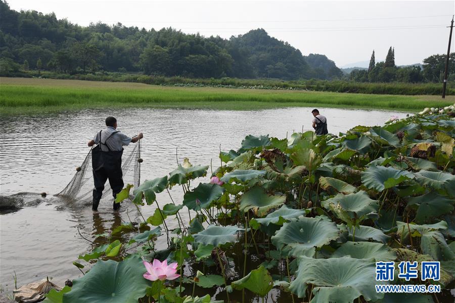8月24日,浙江江山市凤林镇桃源村村民在荷塘中捕鱼。