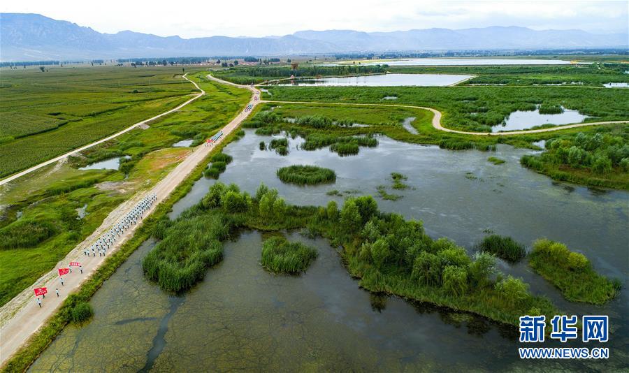 8月24日,广灵县“环湿地千人健步行”参与人员行进在壶流河湿地的道路上。 新华社记者 陶明 摄