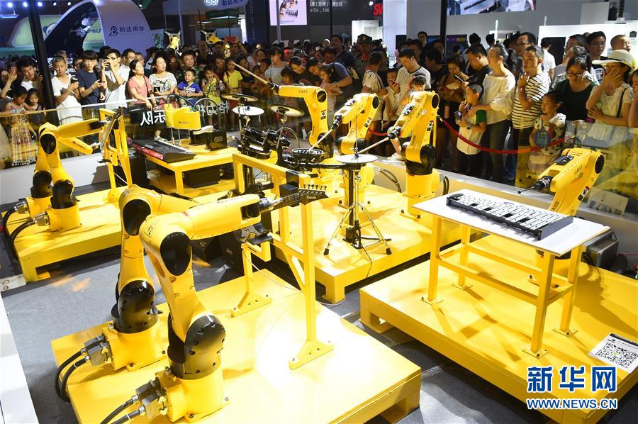 8月24日,观众在智博会现场欣赏机器人乐队演奏乐曲。 新华社记者 唐奕 摄