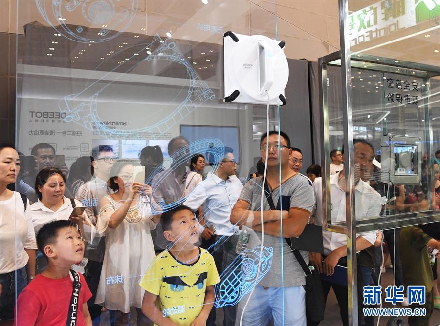 8月24日,观众在2018中国国际智能产业博览会上参观自动擦窗机器人。 新华社记者 王全超 摄