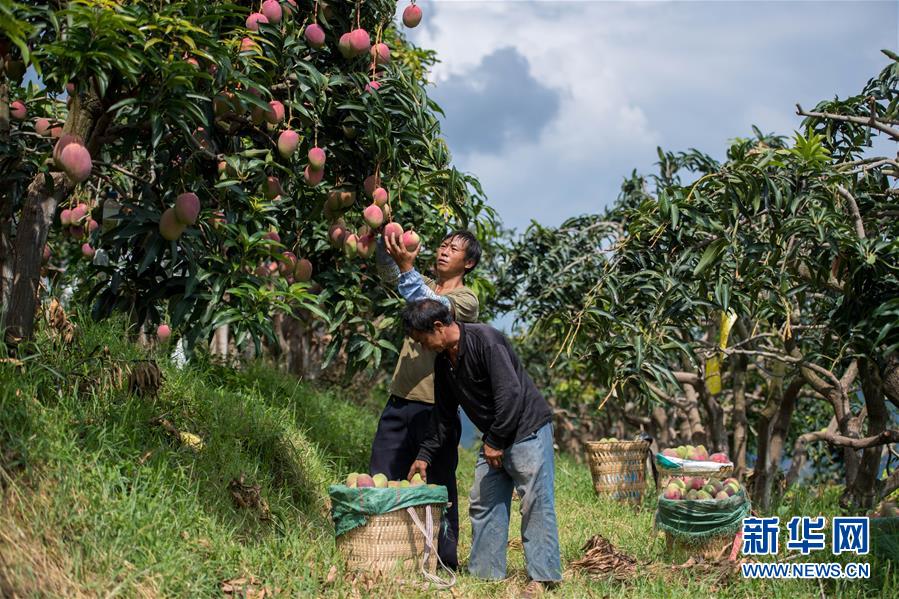 在云南省华坪县荣将镇龙头村果子山上,果农在采摘芒果(8月22日摄)。 新华社记者 胡超 摄