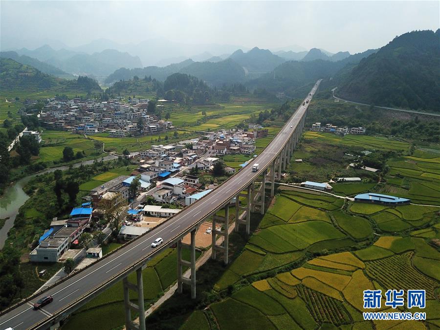 8月25日在贵州省都匀市墨冲镇境内拍摄的兰海高速公路景观(无人机航拍)。 初秋时节,贵州省都匀市墨冲镇周围的水稻田开始变黄,兰(州)海(口)高速公路穿行其间,与公路沿线的美丽乡村相互映衬,美若画卷。 新华社发(杨文斌 摄)