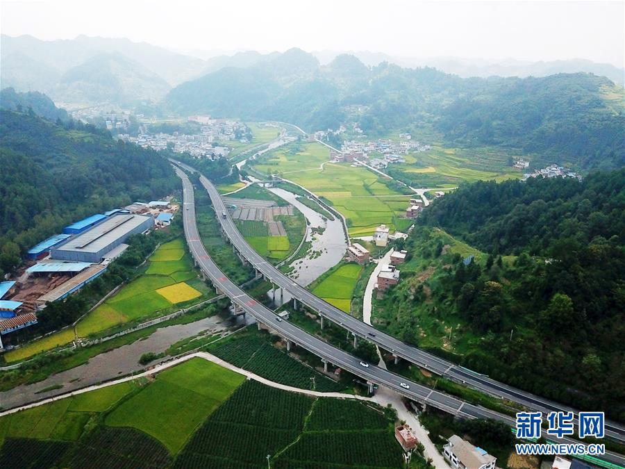 8月25日在贵州省都匀市墨冲镇境内拍摄的兰海高速公路景观(无人机航拍)。 初秋时节,贵州省都匀市墨冲镇周围的水稻田开始变黄,兰(州)海(口)高速公路穿行其间,与公路沿线的美丽乡村相互映衬,美若画卷。 新华社发(杨文斌 摄)