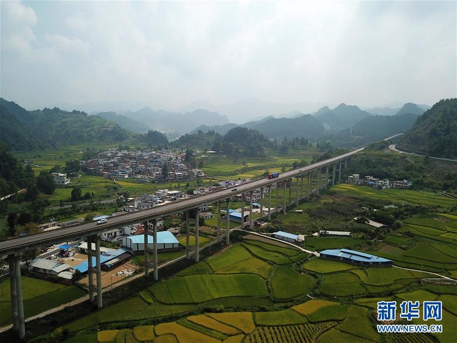 8月25日在贵州省都匀市墨冲镇境内拍摄的兰海高速公路景观(无人机航拍)。 初秋时节,贵州省都匀市墨冲镇周围的水稻田开始变黄,兰(州)海(口)高速公路穿行其间,与公路沿线的美丽乡村相互映衬,美若画卷。 新华社发(杨文斌 摄)