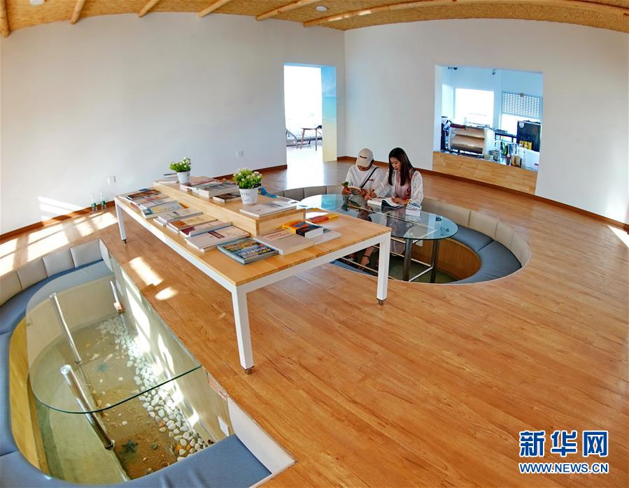8月25日,游客在秦皇岛市北戴河区鸽子窝公园亲海书房翻阅图书。新华社记者 杨世尧 摄