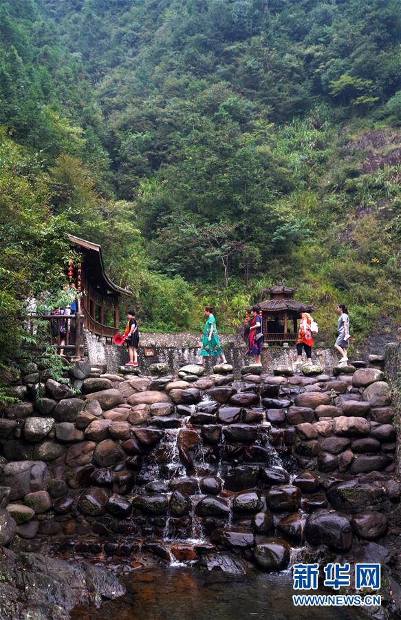 8月25日,游客在浙江开化县齐溪镇龙门村九溪龙门景区游览。 近年来,浙江省衢州市开化县利用其独特的山水资源将全域变为景区,发展旅游致富农家。据统计,2018年1至6月份,开化县总旅游人次同比增长16.83%,总旅游收入同比增长17.11%。 新华社记者 宋振平 摄