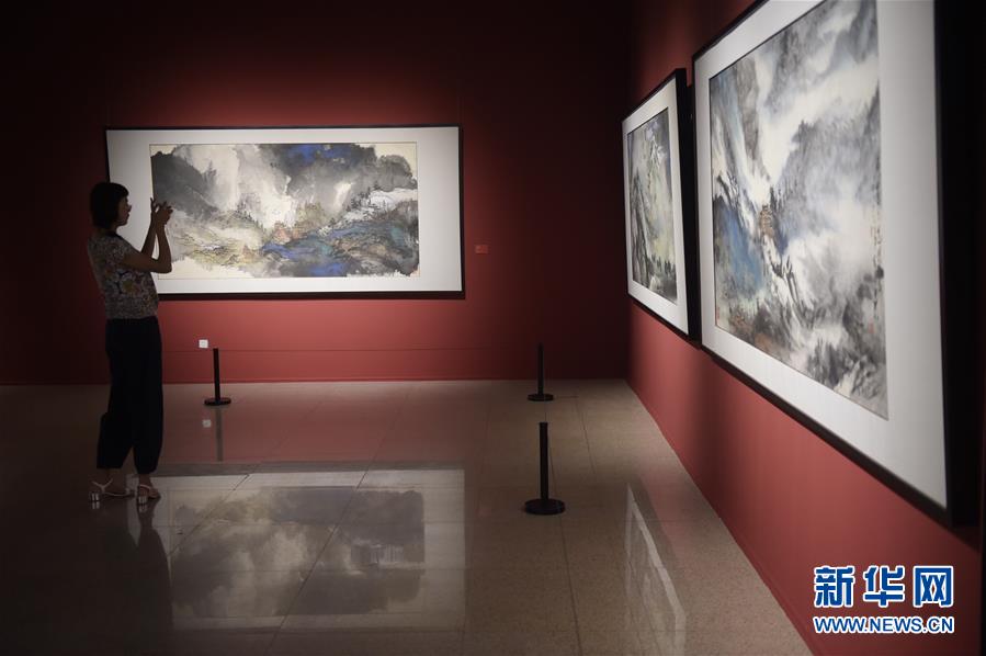 8月25日,观众在中国美术馆参观拍摄展出作品。 当日,由中国美术家协会、中国美术馆、浙江省文学艺术界联合会主办的“千岩竞秀——陆秀竞中国画作品展”,在北京中国美术馆开幕。 新华社记者 鲁鹏 摄