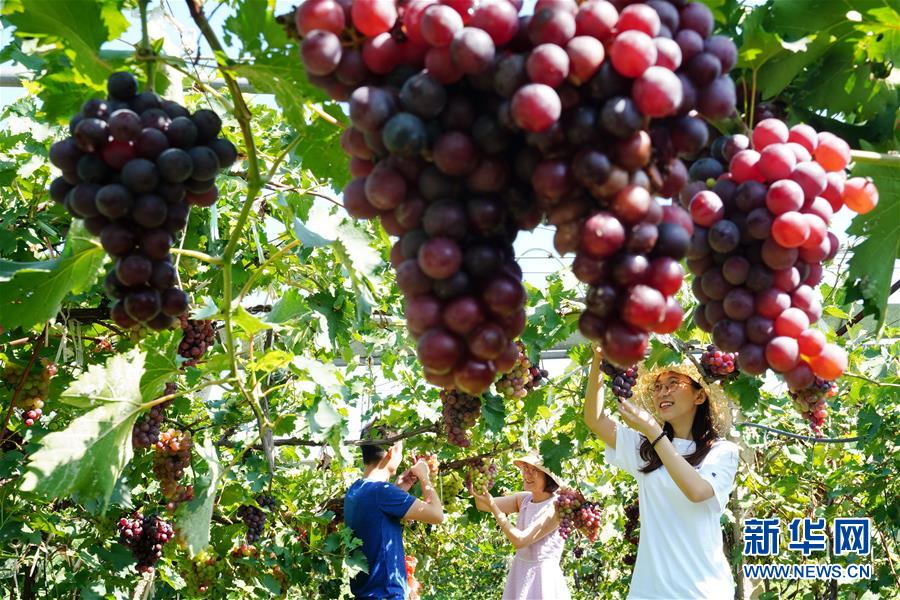 8月25日,游客在河北省唐山市丰润区任各庄镇一家农场内采摘葡萄。 近年来,河北省唐山市丰润区不断调整农业产业结构和发展方式,因地制宜推进休闲农业和乡村旅游发展,建设30余个生态农旅观光项目,打造一批环境优美、宜居宜游、各具特色的美丽乡村样板,为乡村振兴注入活力。 新华社记者 牟宇 摄