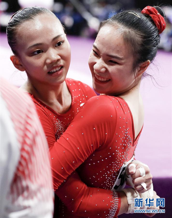 8月24日,第18届雅加达亚运会体操比赛收官。在五个比赛日中,中国体育代表团体操健儿表现精湛,收获8枚金牌,在总数14枚的体操金牌榜上占去大半。 图为8月21日,中国选手陈一乐(左)在第18届亚运会体操女子个人全能决赛后与获得亚军的队友罗欢拥抱庆祝。陈一乐以55.950分的总成绩获得冠军。 新华社记者王丽莉摄