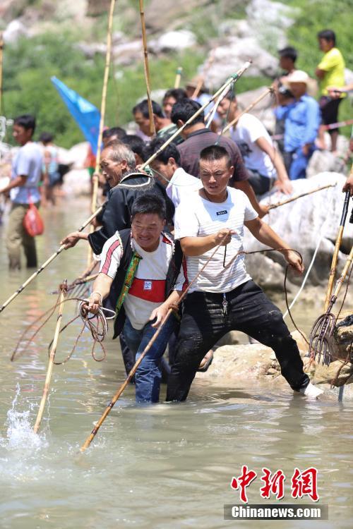 8月25日,苗族同胞正在渔猎。当日,2018贵州福泉·王卡苗寨贵州省级非物质文化遗产“杀鱼节”在福泉市仙桥乡王卡村清水江边举办。“杀鱼节”是渔猎文化向农耕文化过渡的文化遗存,被誉为人类远古集体渔猎生活的“活化石”。 中新社记者 瞿宏伦 摄