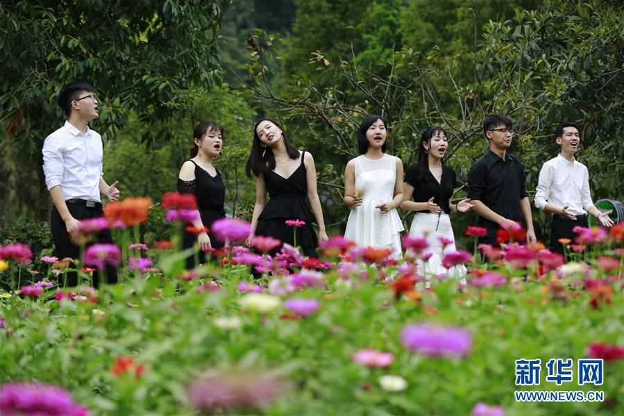 8月25日至26日,参加2018黄龙音乐季合唱艺术周的众多合唱团在张家界市武陵源区黄龙洞景区表演,悠扬的歌声在山野田园间回荡。 新华社发(吴勇兵 摄)