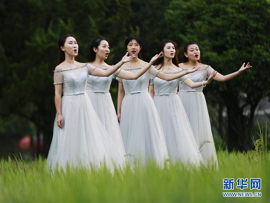 8月25日至26日,参加2018黄龙音乐季合唱艺术周的众多合唱团在张家界市武陵源区黄龙洞景区表演,悠扬的歌声在山野田园间回荡。 新华社发(吴勇兵 摄)