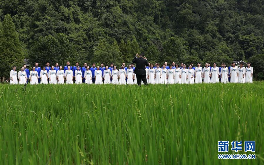 8月25日至26日,参加2018黄龙音乐季合唱艺术周的众多合唱团在张家界市武陵源区黄龙洞景区表演,悠扬的歌声在山野田园间回荡。 新华社发(吴勇兵 摄)