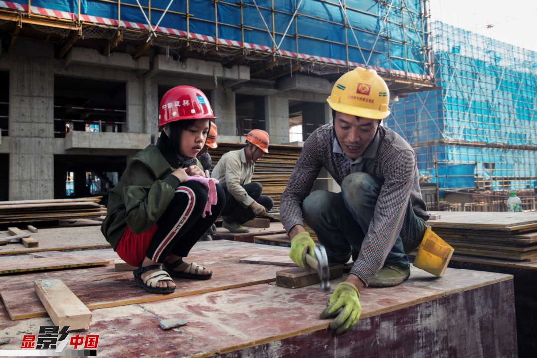 来自四川遂宁的胡思琴只知道爸爸在工地干活,但她不知道爸爸在工地上从事的是木工工作,这是她第一次近距离观看爸爸干活。新华网发 (鲍禹 摄)