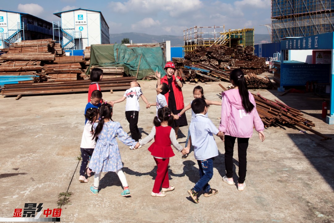 结束在工地的参观回到工人生活区,工作人员带领孩子们做游戏。新华网发 (鲍禹 摄)