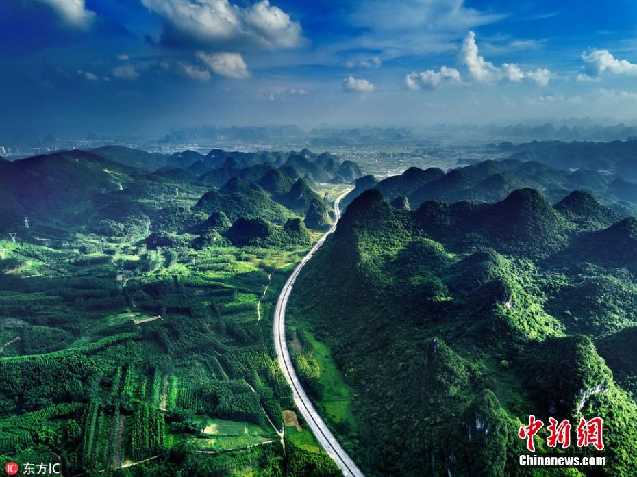 广西秀丽的山水风光举世闻名,走在广西大地,到处看到如“桂林山水”似的风景。广西S31三北高速公路,是从柳州三江县至北海的一条高速公路,一路经过的山水和田野,山峦重叠、青山绿水、阡陌交通,风景美如画,一处处世外桃源的景象。图为三北高速经过的柳州市郊区。梁霞舜 摄 图片来源:东方IC 版权作品 请勿转载
