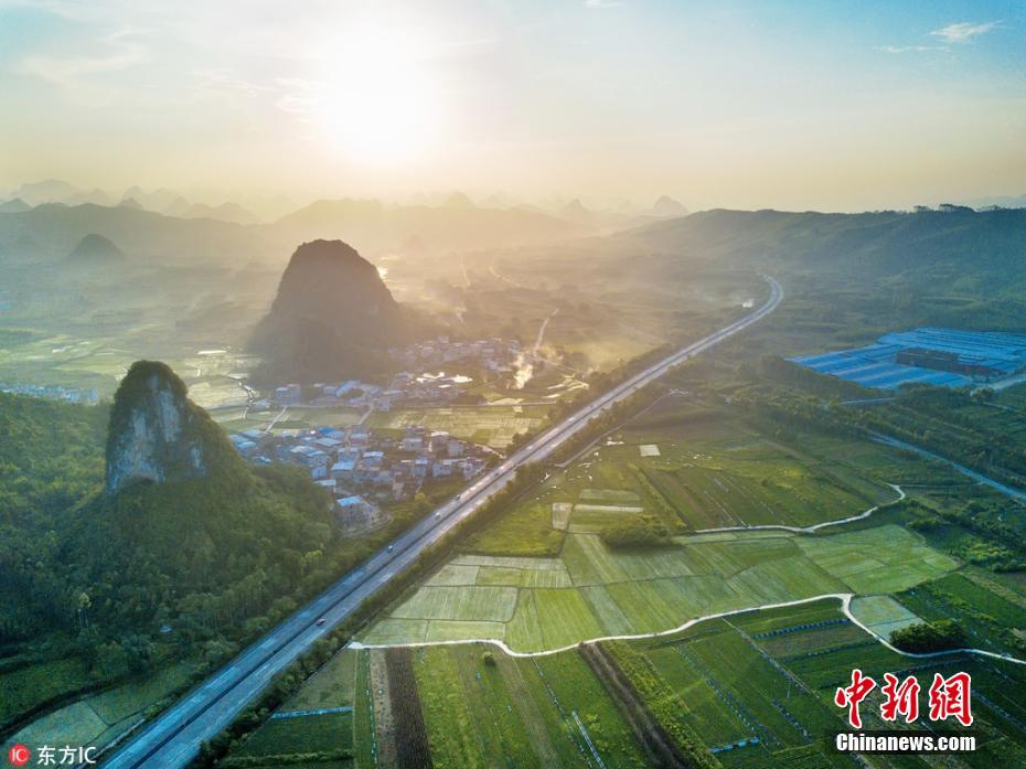 广西秀丽的山水风光举世闻名,走在广西大地,到处看到如“桂林山水”似的风景。广西S31三北高速公路,是从柳州三江县至北海的一条高速公路,一路经过的山水和田野,山峦重叠、青山绿水、阡陌交通,风景美如画,一处处世外桃源的景象。图为三北高速经过的柳州市郊区。梁霞舜 摄 图片来源:东方IC 版权作品 请勿转载