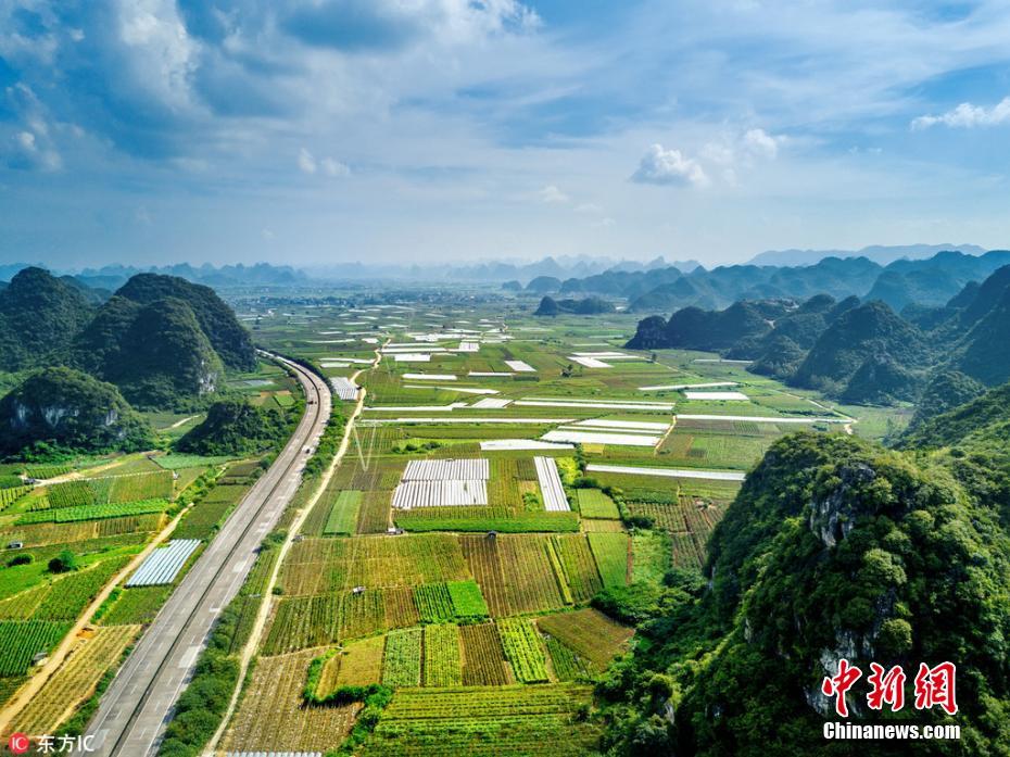 广西秀丽的山水风光举世闻名,走在广西大地,到处看到如“桂林山水”似的风景。广西S31三北高速公路,是从柳州三江县至北海的一条高速公路,一路经过的山水和田野,山峦重叠、青山绿水、阡陌交通,风景美如画,一处处世外桃源的景象。图为柳州市柳江区高速公路及山水田园风光。梁霞舜 摄 图片来源:东方IC 版权作品 请勿转载