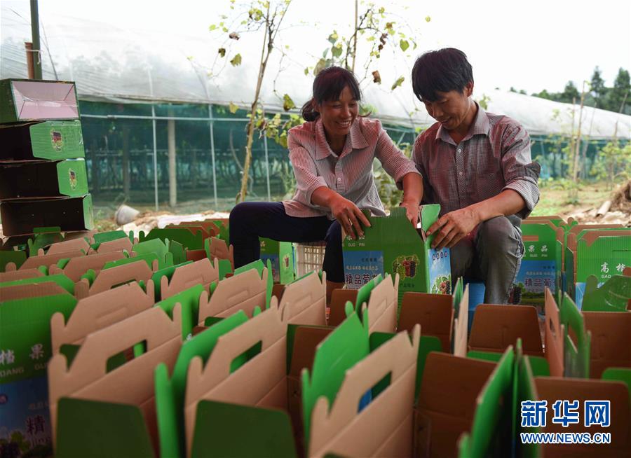 8月26日,松桃苗族自治县长坪乡兴隆村村民刘平芝(左)帮助丈夫整理葡萄包装盒。 新华社发(龙元彬 摄)
