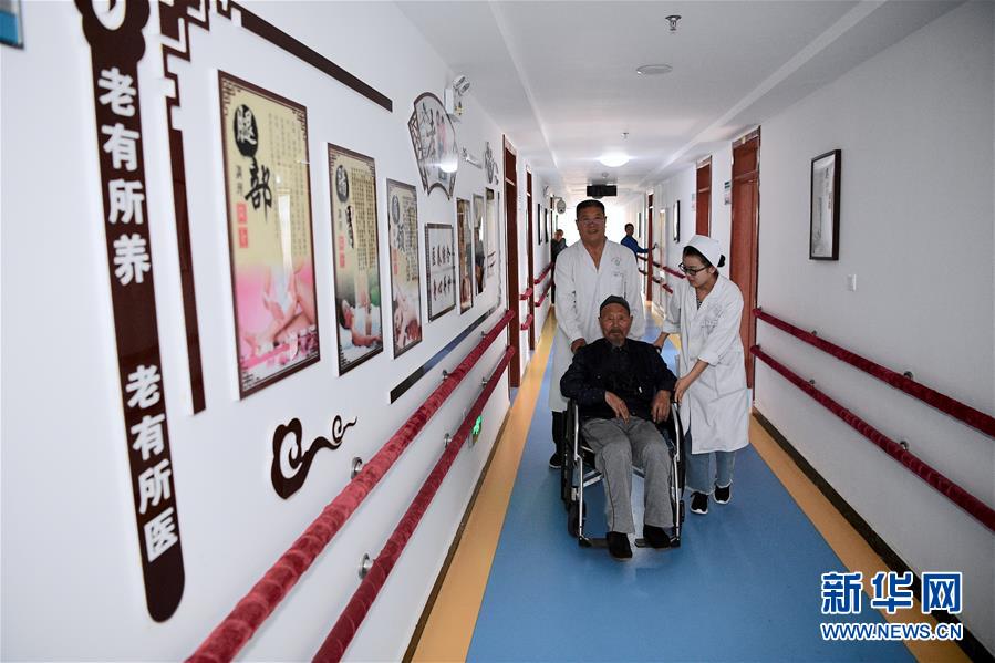 8月27日,在彭阳县综合福利服务中心医养结合护理区,工作人员推着行动不便的老人。 新华社记者王鹏摄