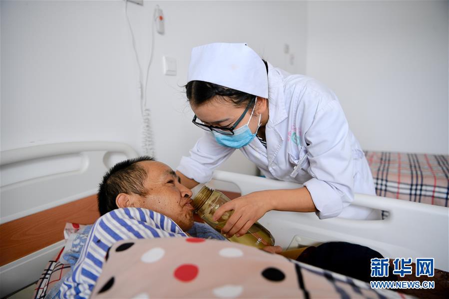 8月27日,在彭阳县综合福利服务中心医养结合护理区,工作人员在为老人喂水。 新华社记者王鹏摄