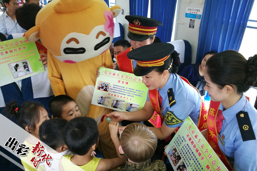 陈美芳(右二)正在开展“跟着安安坐火车”列车安全知识宣传活动。本人供图