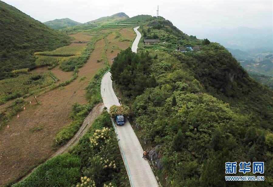 8月27日,在贵州省石阡县枫香乡黄金山村,农民利用卡车搬运生产青贮饲料所需的玉米秸秆(无人机拍摄)。 新华社发(杨文斌 摄)