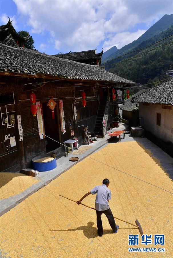 8月27日,湖北省宣恩县彭家寨的居民彭武尚在吊脚楼的空地上翻晒玉米。新华社发(宋文 摄)